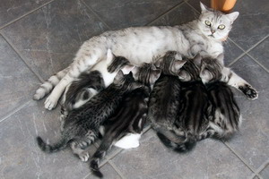 schenkt! Nach dem letzten Wurf, der komplett am Jahrestag der Geburt dieses Wurfes gestorben ist, haben wir nicht mehr mit Kitten gerechnet! Zumal wir Ticky auch 2 x decken ließen und sie beides Male nicht aufgenommen hatte, waren wir über diese Trächtigkeit überrascht und erfreut! WELL DONE, Ticky! 01.06.2012: Geburt 01.06.2012: Edelweiß und Egon können schon den Kopf anheben. 05.06.2012: Elana verliert ihre Nabelschnur. 06.06.2012: Elbrus kann den Kopf heben und hat das rechte Auge geöffnet. 07.06.2012: Elliot und Egon verlieren ihre Nabelschnur, Elbrus hat beide Augen auf. 08.06.2012: Elliot und Egon können die Augen öffnen, Eyra und Elbrus verlieren die Nabelschnur und Elbrus kann den Kopf anheben. 09.06.2012: Elana hat die Augen auf, Elliot kann den Kopf anheben. 10.06.2012: Eyra und Edelweiß haben beide Augen auf und Edelweiß putzt sich. 11.06.2012: Elbrus kann sich (und mich) auch schon putzen. 12.06.2012: Auf einmal können alle Kitten hören. 14.06.2012: Edelweiß kann schon richtig laufen! 15.06.2012: Fotoshooting! 17.06.2012: Umzug in's Wohnzimmer! 18.06.2012: Die ersten spielerischen Kämpfe beginnen! 22.06.2012: Erneutes Fotoshooting! 22.06.2012: Jedes Kitten erhält seine eigene Fotogalerie! 24.06.2012: Wie ja schon vermutet, verläßt Elbrus als Erster die Wurfkiste! 25.06.2012: Elliot folgt Elbrus aus der Kiste heraus! 26.06.2012: Eyara, Elana und Egon trauen sich ebenfalls ;-) 27.06.2012: Edelweiß macht das Schlußlicht in Sachen "weg mit der Kiste". 28.06.2012: Edelweiß beginnt mit dem Fressen! Sie wagt sich direkt an rohen Fisch! 29.06.2012: Die Geschwister folgen Edelweiß Beispiel und fressen ein wenig! 29.06.2012: Die Kitten sind 4 Wochen alt und erhalten wieder einmal ein Fotoshooting! 01.07.2012: Das Katzenklo wird schon richtig oft benutzt :-) 06.07.2012: Fotoshooting im Garten - aber die Bilder sind noch nicht online. 13.07.2012: Der Laufstall ist zum Grossteil abgebaut. Nun wird das Wohnzimmer erkundet! Fotoshootimg auf der Küchenbank! 24.07.2012: Die erste Impfung haben alle Kitten mit großem Lob des Tierarztes wegen tadellosem Benehmen und gutem Pflegezustand überstanden. 10.08.2012: Heute wurde der letzte Kaufvertrag unterzeichnet und ich freue mich sehr, dass alle Kitten sooo wunderbare Plätze gefunden haben. Besonders freue ich mich, dass Elbrus und Eyra zusammenbleiben werden, und Elliot mit Lucca zusammen geht :-) Ich bedanke mich schon heute, dass ich diese wunderbaren Menschen kennenlernen durfte, die in gut 2 Wochen meine süßen Kleinen adoptieren werden! |